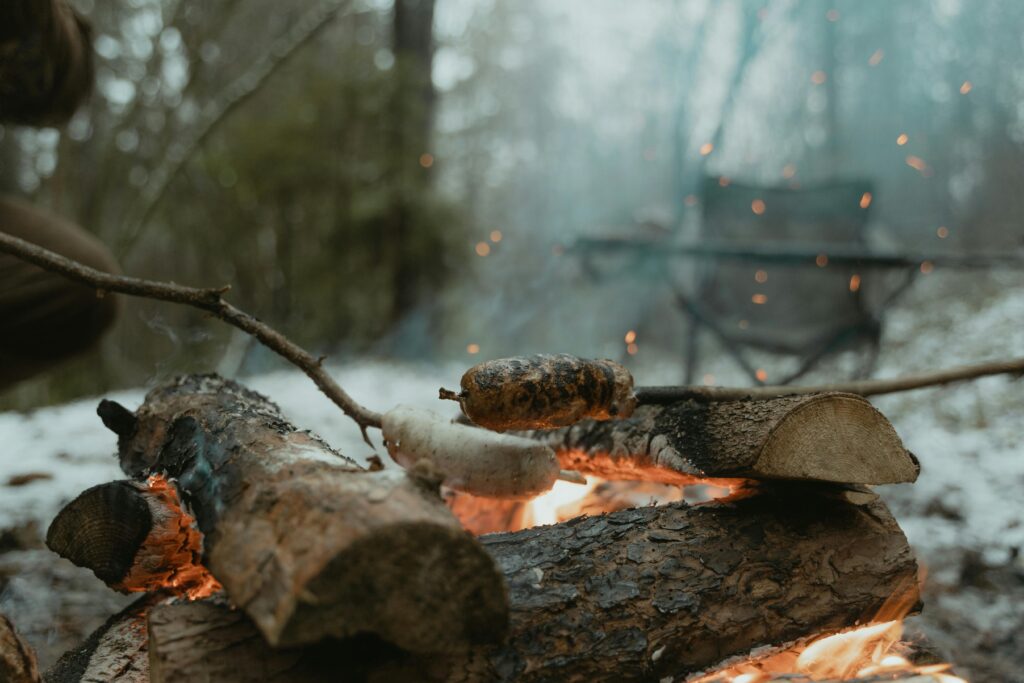 Kamperen: Buiten koken tijdens kampeertrips omvat vaak eenvoudige technieken zoals het gebruik van een draagbare kookplaat, kampvuur koken met rooster of spiesjes, het bereiden van maaltijden in aluminiumfoliepakketten, en het koken van maaltijden op een draagbare grill of vuurkorf.